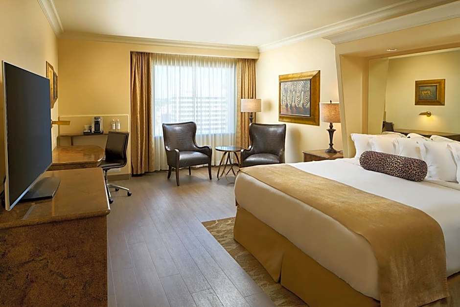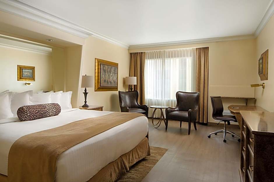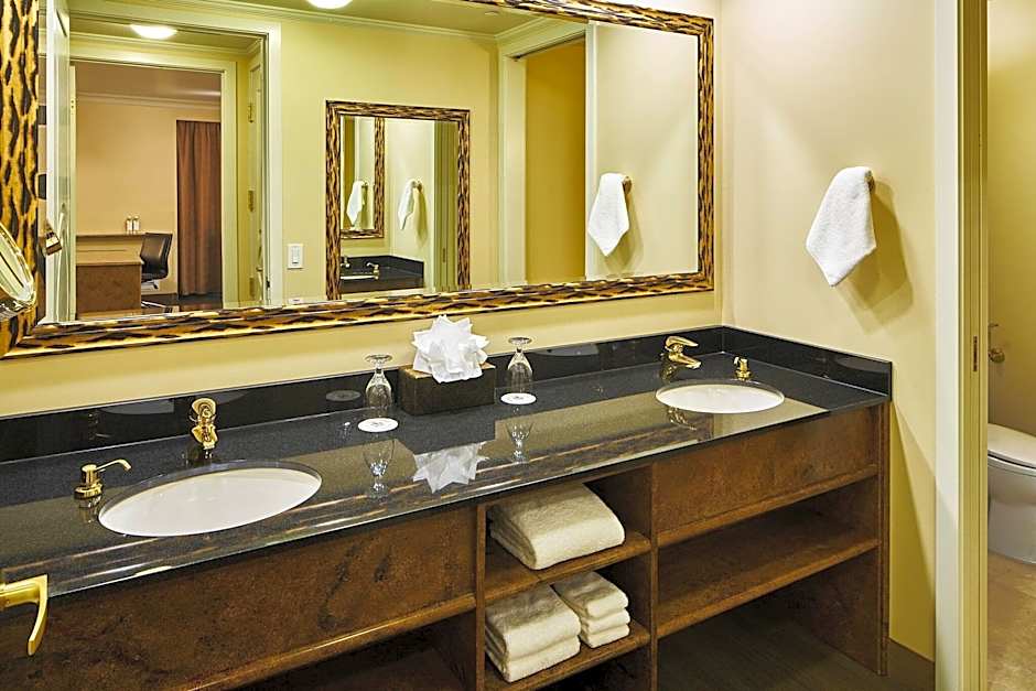 Original oil canvas paintings, custom-made furniture, and an over-sized marble shower are featured in this spacious and classically designed suite. Extras include a separate seating area and a marble wet bar.